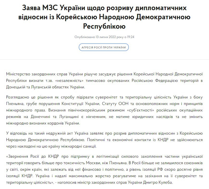 Киев отмечает, что политические и экономические контакты с КНДР и так не осуществляются из-за наложенных на страну международных санкций.