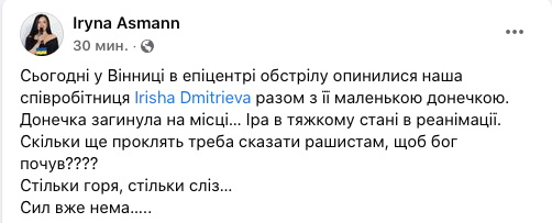 На видео из соцсетей мамы видно, что они спокойно идут по своим делам по мирному городу вдалеке от линии фронта, не подозревая о грядущем ужасе. Видео записано в 09:38, а уже в 10:50 на Винницу упали российские ракеты.