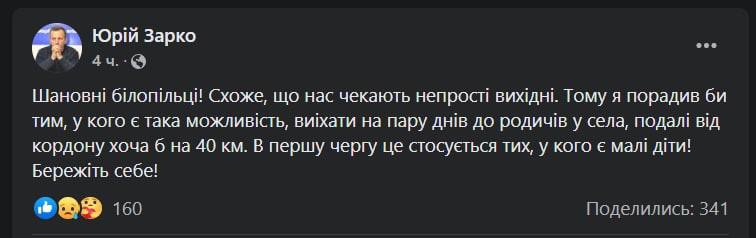 В частности, Зарко пишет в Facebook: "Похоже, что нас ждут непростые выходные. Поэтому я посоветовал бы тем, у кого есть такая возможность, выехать на пару дней к родственникам в села, подальше от границы хотя бы на 40 км. В первую очередь это касается тех, у кого есть маленькие дети! Берегите себя!".