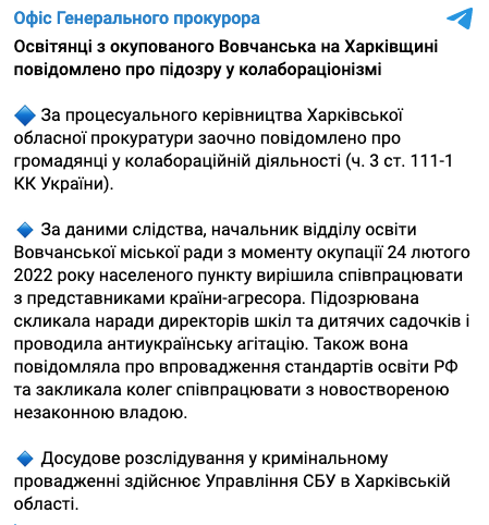 Работнице сферы образования из подконтрольного России Волчанска (Харьковская область) сообщили о подозрении в коллаборационизме.