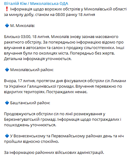 "Около 03:00 18 июля Николаев снова подвергся массированному ракетному обстрелу. По предварительной информации, известно о попадании в автосалон и салон по продажам сельхозтехники. Другие попадания были по окрестностям города. Предварительно, без жертв. Подробная информация уточняется", - сообщил он.