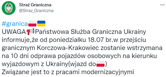 Государственная пограничная служба Украины также информирует, что с 18 июля в пункте пропуска Корчова-Краковец на 10 суток прекращается пропуск пассажирского транспорта в направлении выезда из Украины.
