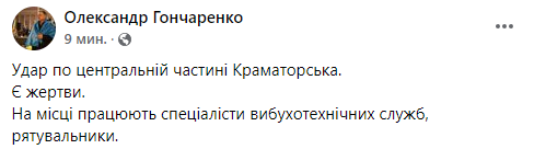Удар по центру Краматорска. Фото: Facebook/alexander.vasilyevich.goncharenko