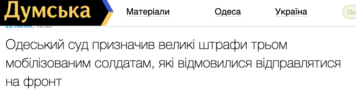 Одесский суд назначил штрафы по 71 400 гривен трем мобилизованным солдатам, которые отказались отправляться на фронт. В итоге они согласились на фронт пойти и штрафы заплатят.
