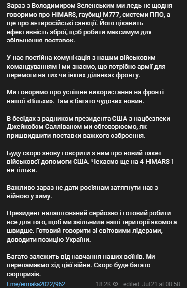 "Важно сейчас не дать русским затянуть нас с войной в зиму. Президент Владимир Зеленский настроен серьезно и готов делать все для того, чтобы мы освободили наши территории как можно скорее. Многое зависит от обучения наших воинов. Мы переломим ход этой войны. Скоро будет много сюрпризов", - заявил Ермак.