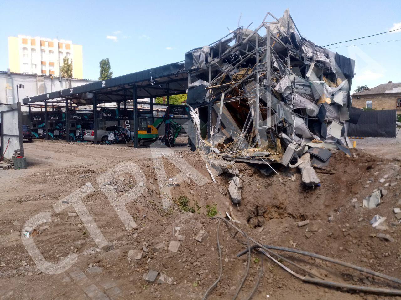 А на этом фото видно, что ракета попала в станцию автомойки. Чудом не взорвалась находящаяся рядом станция заправки машин газом.