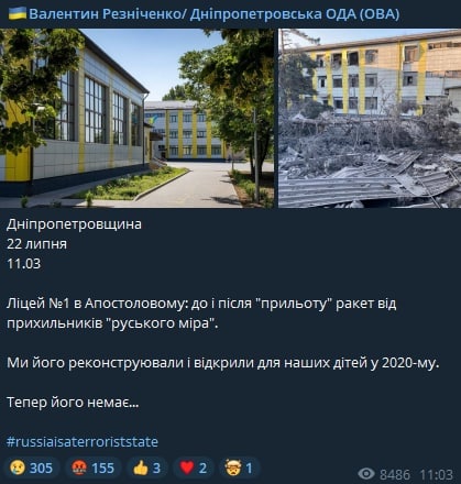 В Покровской общине враг ударил по складам. В Апостолово семь прилетов, ракеты попали по трем школам, они разрушены. Предварительно, 8 человек ранены, информация еще уточняется.