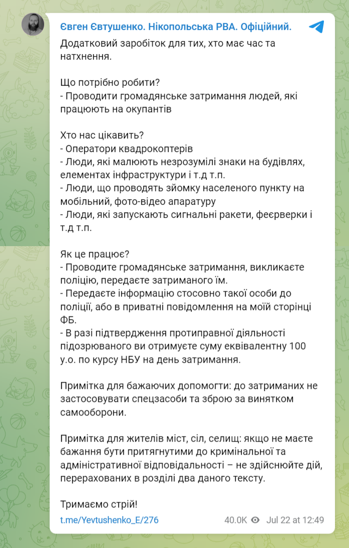 Глава Никопольской районной военной администрации Евгений Евтушенко предлагает местным жителям за 100 долларов задерживать подозрительных лиц, которые "работают на оккупантов".