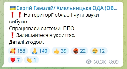 В Хмельницкой области прогремели взрывы. Сработали системы ПВО