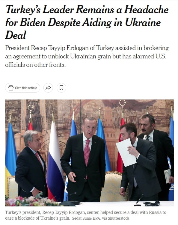 Но поделать с Эрдоганом США ничего не могут, поскольку у Турции - ключевая роль на стыке Запада и Востока, как географически, так и геополитически. Это подтвердилось и при заключении "зерновой сделки".