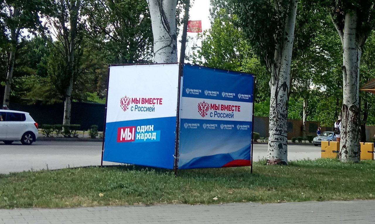 В городе появились стенды с лозунгом "Мы один народ с Россией" и наружная реклама такого же содержания.