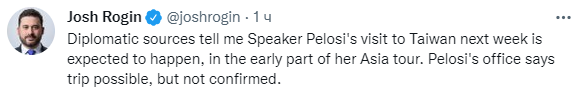 "Дипломатические источники говорят, что поездка спикера Пелоси на Тайвань ожидается в начале ее азиатского турне", - написал репортер.