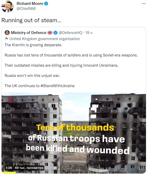 Силы России в Украине выдыхаются, из-за чего отчаяние в Кремле растет. Россиянам не удастся одержать победу в войне, которую они развязали. Об этом сообщил глава британской службы внешней разведки МИ-6 Ричард Мур в Twitter.