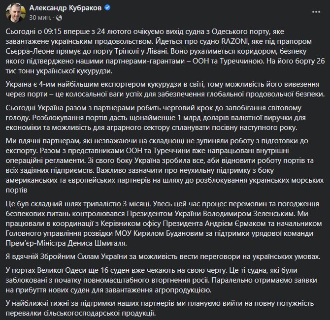 1. «Сегодня началось выполнение инициативы по экспорту украинского зерна из наших портов на Черном море. Первое судно, перевозящее 26 тысяч тонн кукурузы, вышло из порта Одессы. Своей очереди отправления уже ждут 16 судов, и мы готовы внести надлежащий вклад в стабилизацию мирового рынка продовольствия».