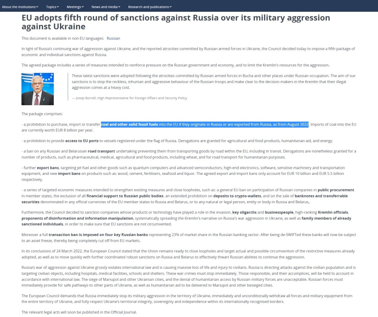 Оно входит в пятый пакет санкций, принятый в начале апреля 2022 года.