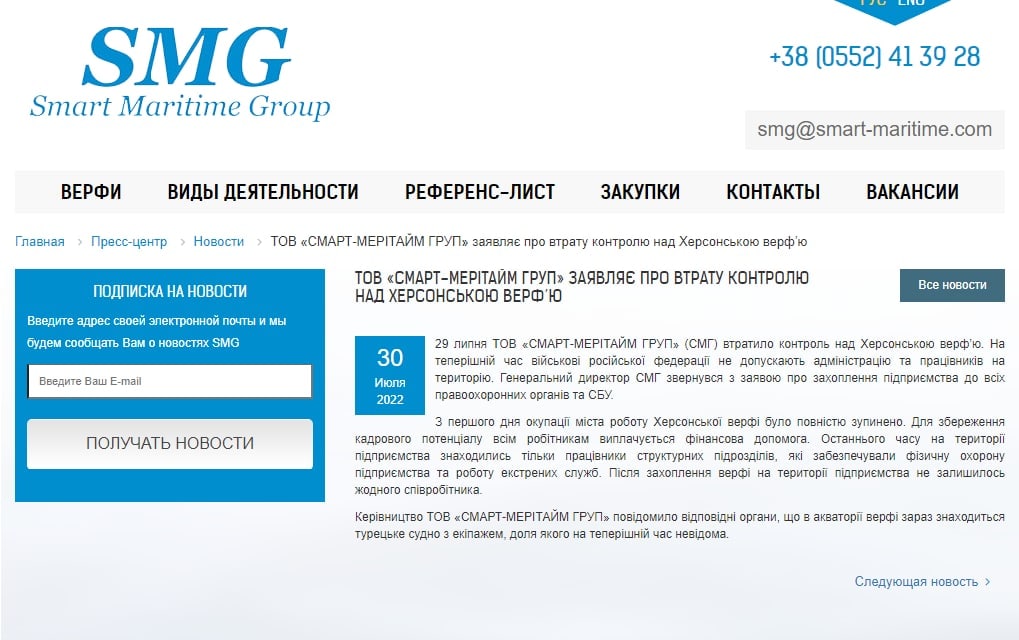 Согласно сообщению пресс-службы холдинга, военные РФ не допускают администрацию и работников на территорию верфи.
