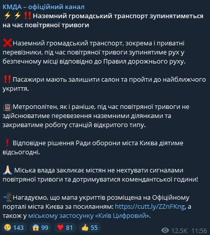 12:01 В Киеве наземный общественный транспорт будет останавливаться на время воздушной тревоги, сообщают в КГГА.
