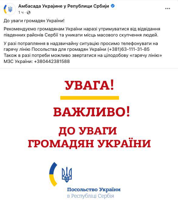 Граждан Украины призывают также избегать мест массового скопления людей, а при попадании в чрезвычайную ситуацию звонить на горячую линию посольства по телефону +381631113185 либо на круглосуточную "горячую линию" МИД Украины: +380442381588.