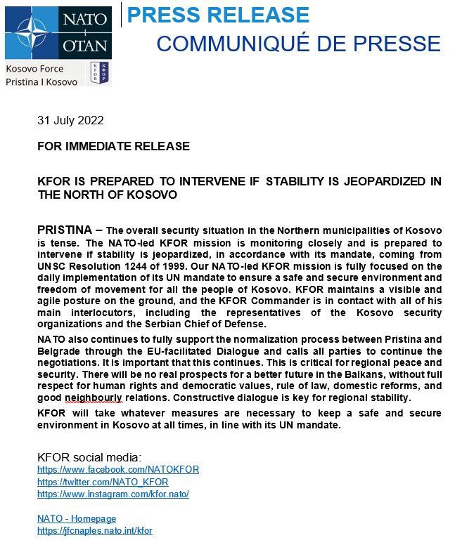 На Балканах продолжает обостряться ситуация. Силы НАТО в Косово (KFOR)  заявили о готовности вмешается, если стабильность северных районов частично признанной республики окажется под угрозой.