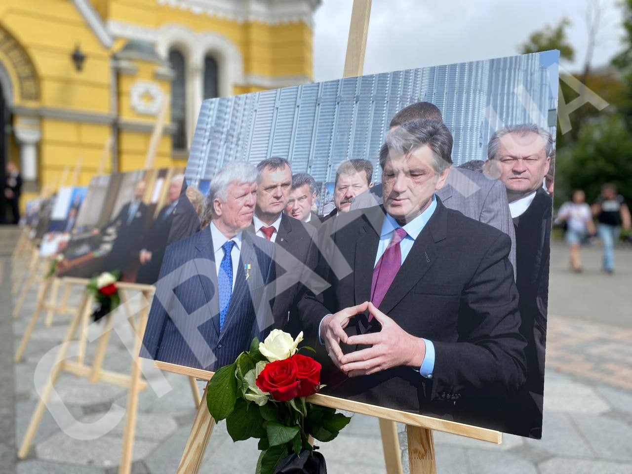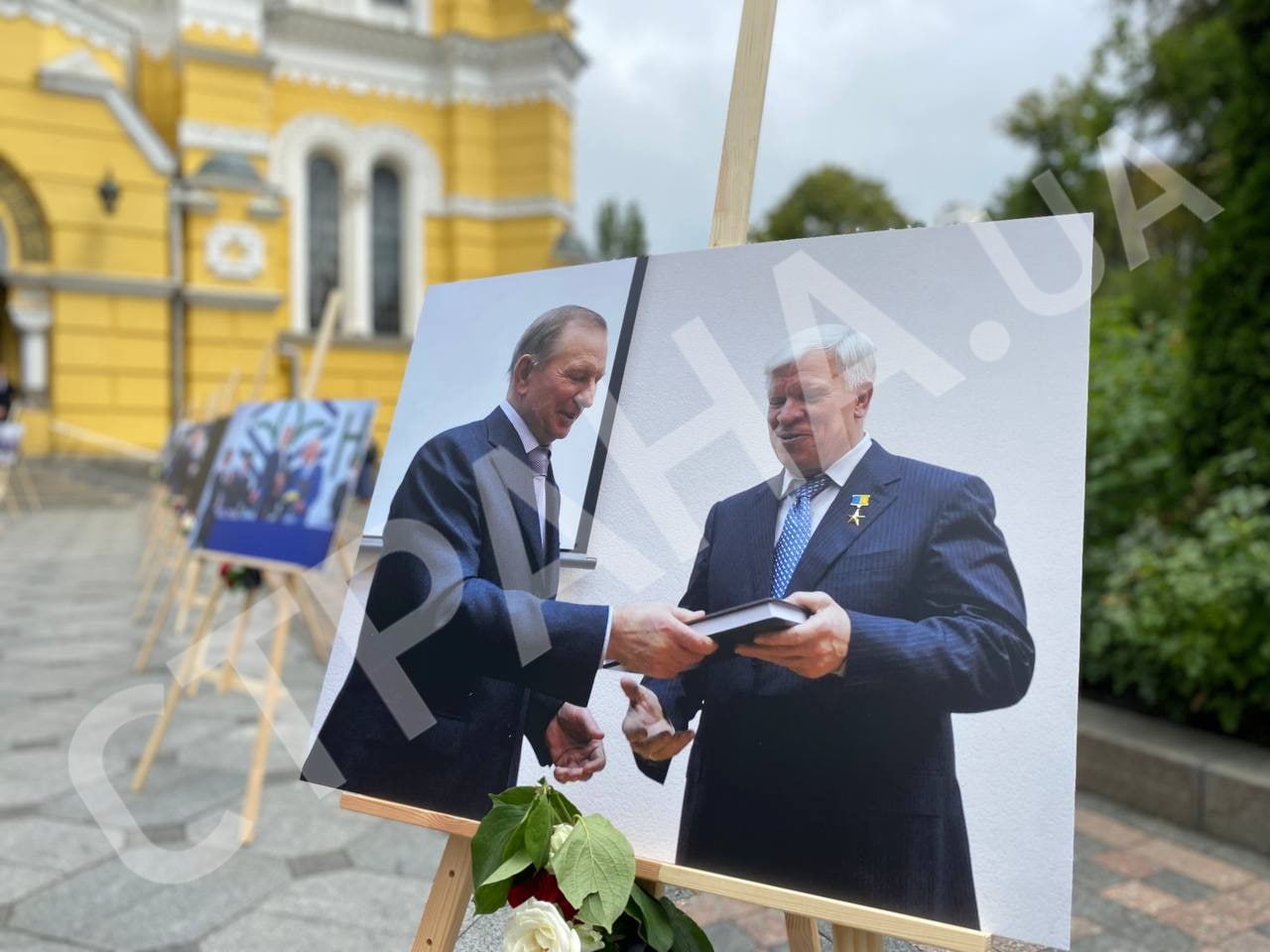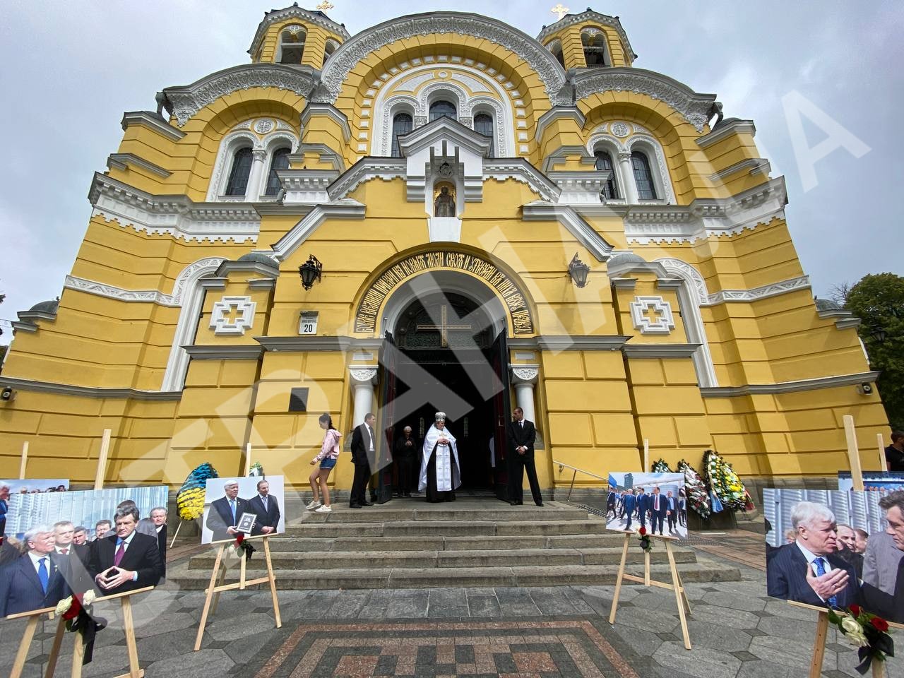 У входа во Владимирский собор поставили фотографии агробизнесмена с известными личностями. Есть фото с президентами Украины, Кучмой, Ющенко и Порошенко. С Зеленским фотографии нет.