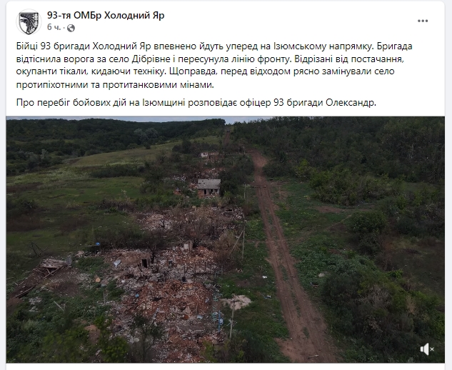 Вооружённые Силы Украины освободили от российских военных село Дибровное под Изюмом в Харьковской области. Тем самым украинская сторона смогла передвинуть линию фронта.