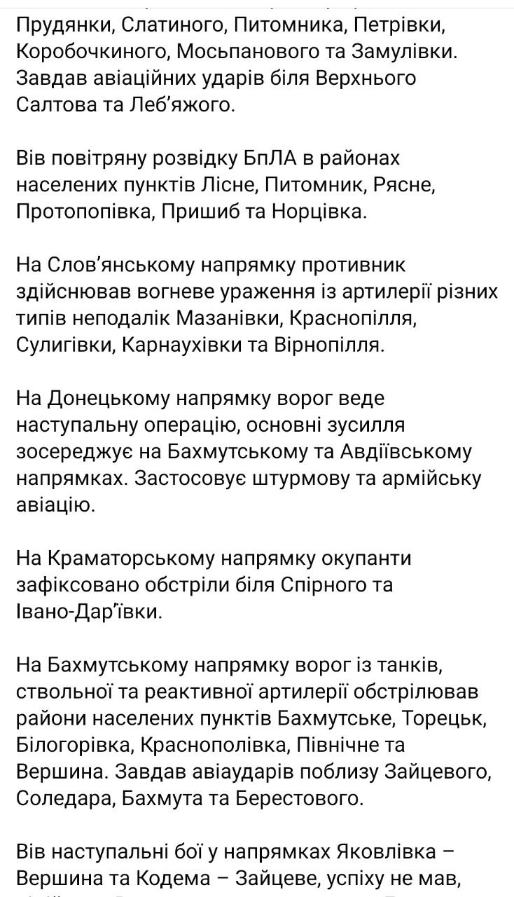 1. На Харьковском направлении обстрелял из ствольной и реактивной артиллерии районы Прудянки, Слатино, Питомника, Петровки, Коробочкиного, Мосьпанова и Замуловки. Нанес авиационные удары возле Верхнего Салтова и Лебяжьего.