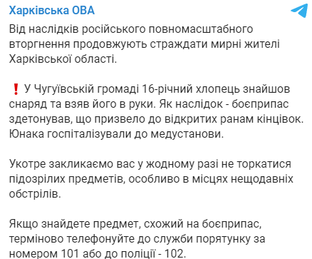 16-летний подросток пострадал из-за неосторожного обращения с неразорвавшимся снарядом в Чугуевской территориальной громаде Харьковской области.