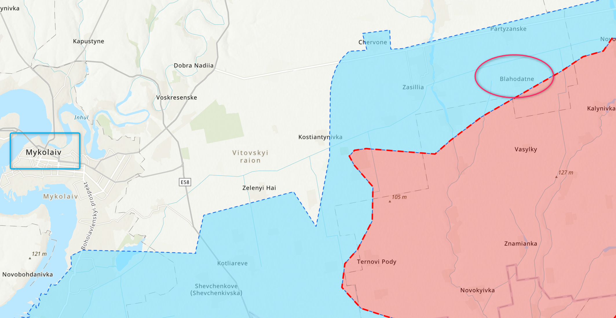Заявлялось, что противник вошел в Благодатное - населенный пункт к северу от Херсона западнее Снигиревки и вблизи трассы на Николаев.