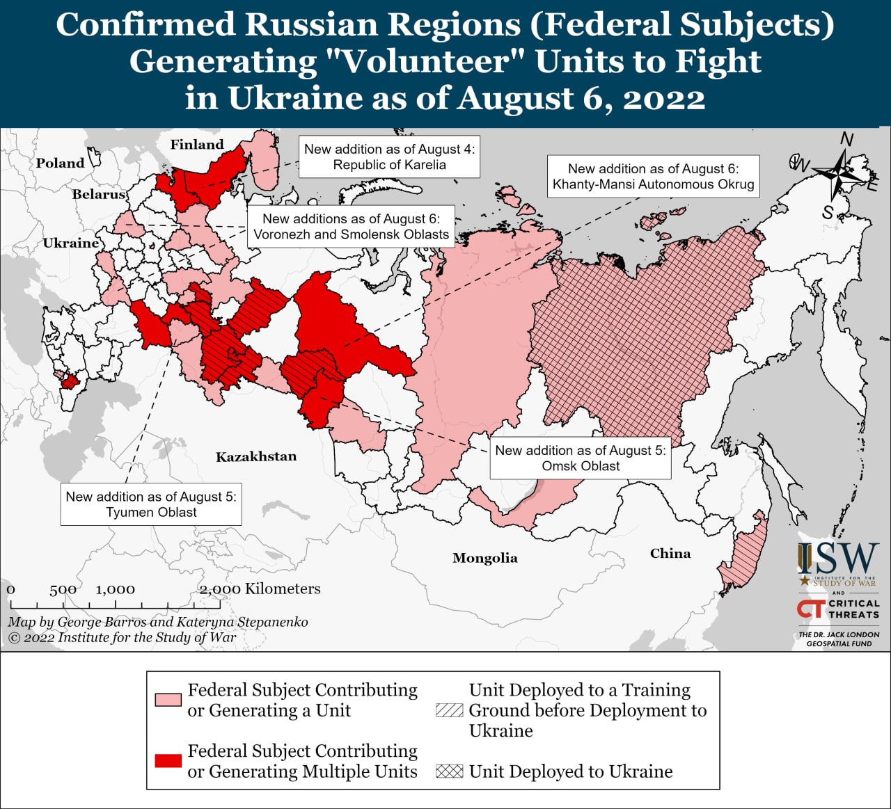 Институт изучения войны публикует карту российских регионов, где подтверждено формирование добровольческих соединений для войны в Украине.