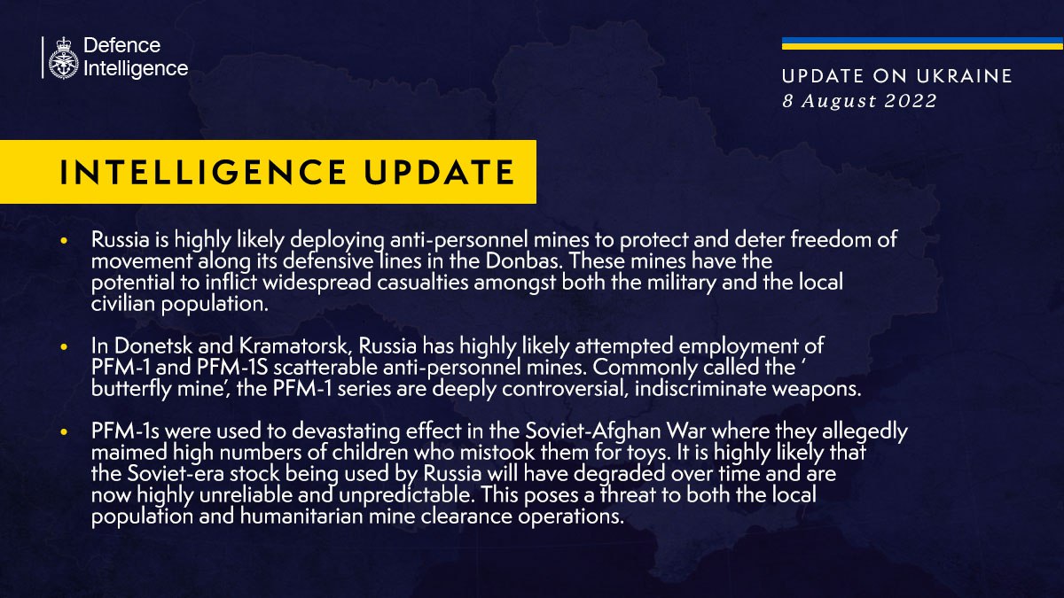 По данным британской разведки, россияне с большой долей вероятности устанавливают противопехотные мины вдоль своих оборонительных рубежей на Донбассе.