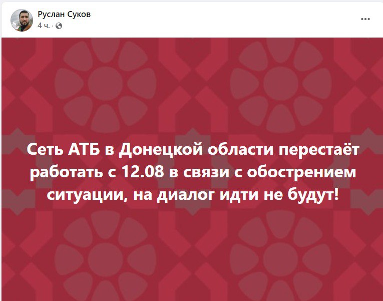 Сеть супермаркетов АТБ прекращает свою деятельность в Донецкой области с 12 августа в связи с обострением ситуации.