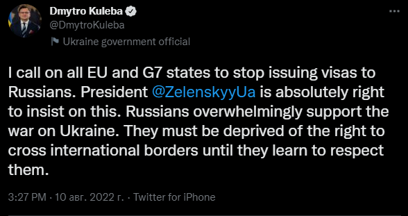 Министр иностранных дел Украины Дмитрий Кулеба призвал страны Европейского Союза и "Большой семерки" прекратить выдавать визы россиянам.