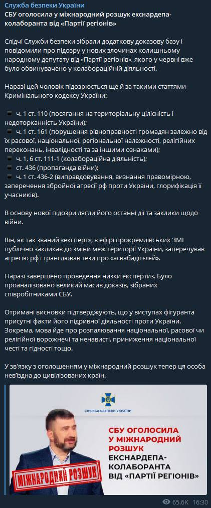 "Он в эфире прокремлевских СМИ публично призывал к изменению границ территории Украины, отрицал агрессию России и транслировал тезисы об "освободителях", - говорится в сообщении.