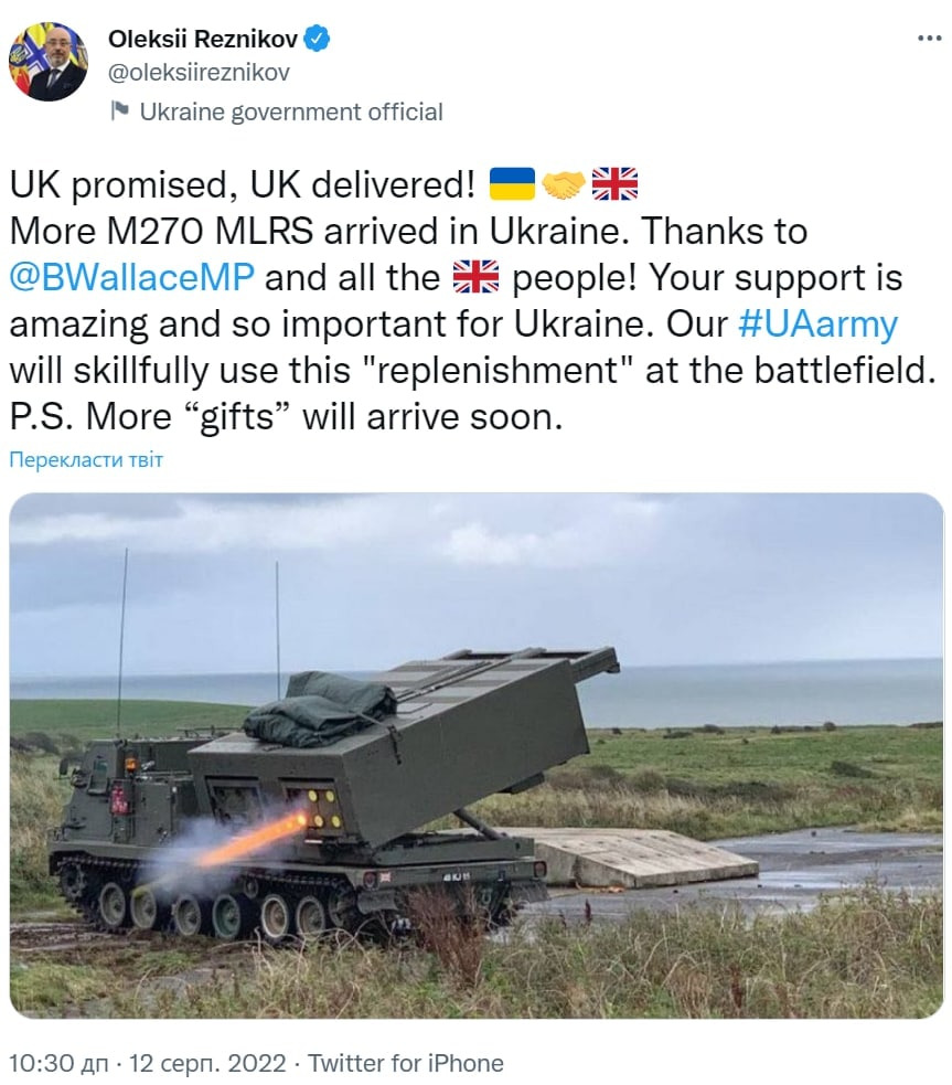 10:51 В Украину прибыли новые системы M270 от Великобритании, сообщил министр обороны Алексей Резников.