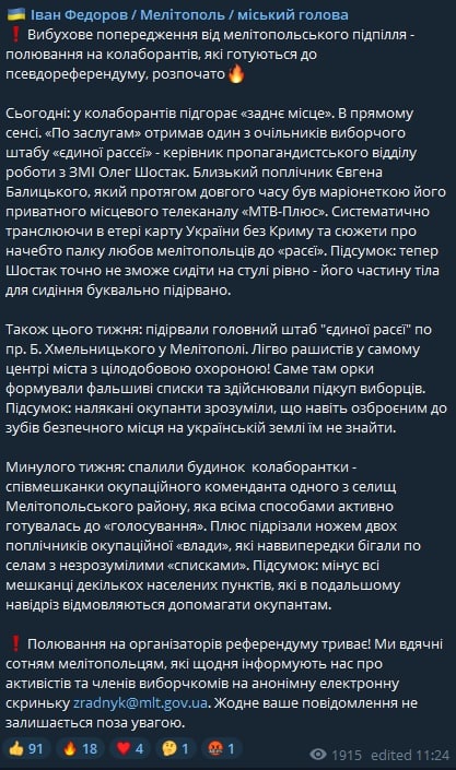 "Напомню, что движение сопротивления тщательно следит за коллаборантами, знает каждого в лицо и по имени и никого не оставит без надлежащего внимания", - написал Федоров.