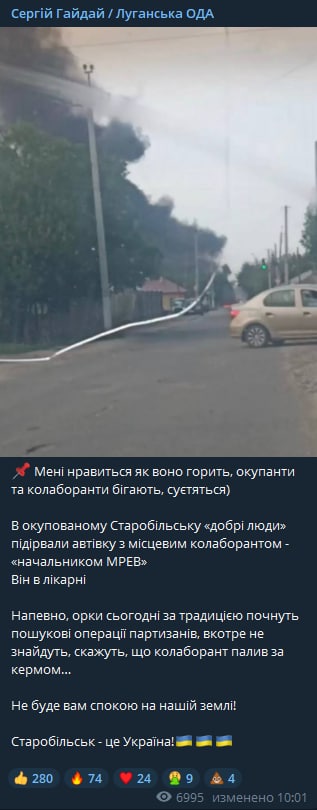 12:10 В оккупированном Старобельске Луганской области взорвали машину начальника местного "МРЭО", сообщил глава Луганской ОВА Сергей Гайдай.