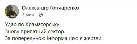 20:46 Двое погибших и 13 раненых в результате удара по Краматорску.