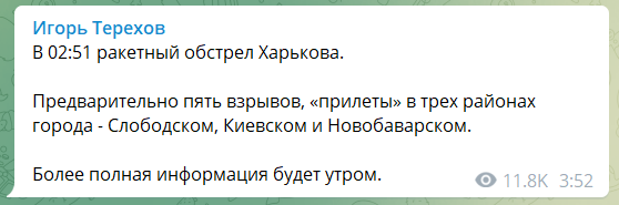 По его словам, попадания пришлись по Слободскому, Киевскому и Новобаварскому районам. Обстрел начался около 02:51.