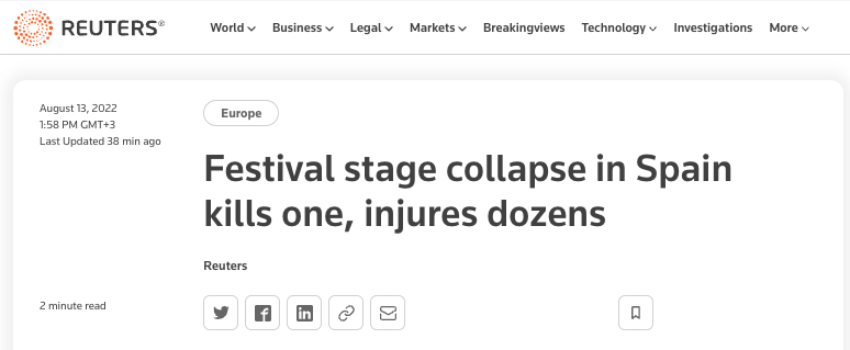 В пригороде испанской Валенсии сильный ветер вызвал обвал части сцены на фестивале танцевальной музыки. В результате по меньшей мере один человек погиб и десятки получили ранения.
