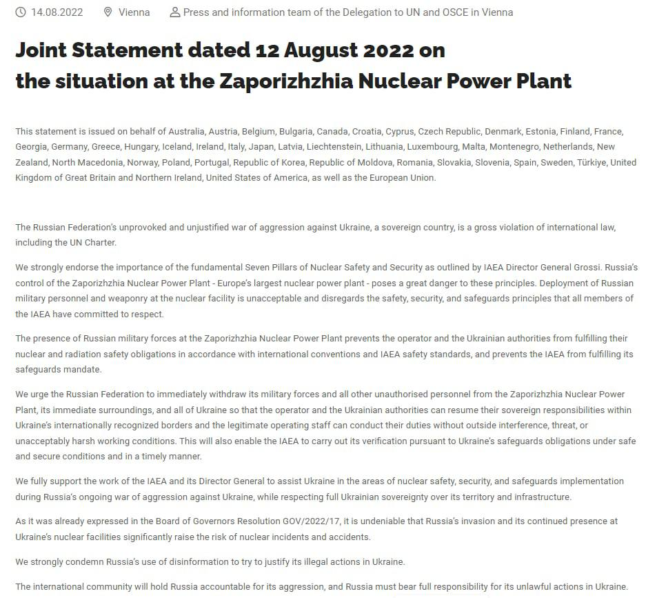 "Мы призываем Российскую Федерацию немедленно вывести свои военные силы и весь другой неуполномоченный персонал из Запорожской атомной электростанции, ее ближайших окрестностей и всей Украины, чтобы оператор и украинские власти могли восстановить свои суверенные обязанности в рамках международно признанных границ Украины и законный оперативный персонал мог выполнять свои обязанности без внешнего вмешательства, угроз и неприемлемо тяжелых условий труда", - говорится в заявлении.