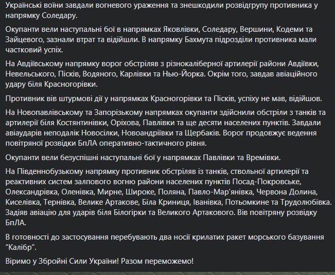 - На Бахмутском направлении украинские воины обезвредили разведгруппу противника в направлении Соледара. Россияне вели наступательные бои в направлениях Яковлевки, Соледара, Вершины, Кодемы и Зайцева, понесли потери и отошли. В направлении Бахмута подразделения противника имели частичный успех.