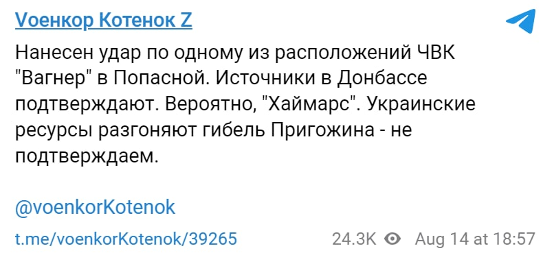 "Нанесен удар по одному из расположений ЧВК "Вагнер" в Попасной. Источники в Донбассе подтверждают. Вероятно, "Хаймарс", - написал Котенок в телеграм.