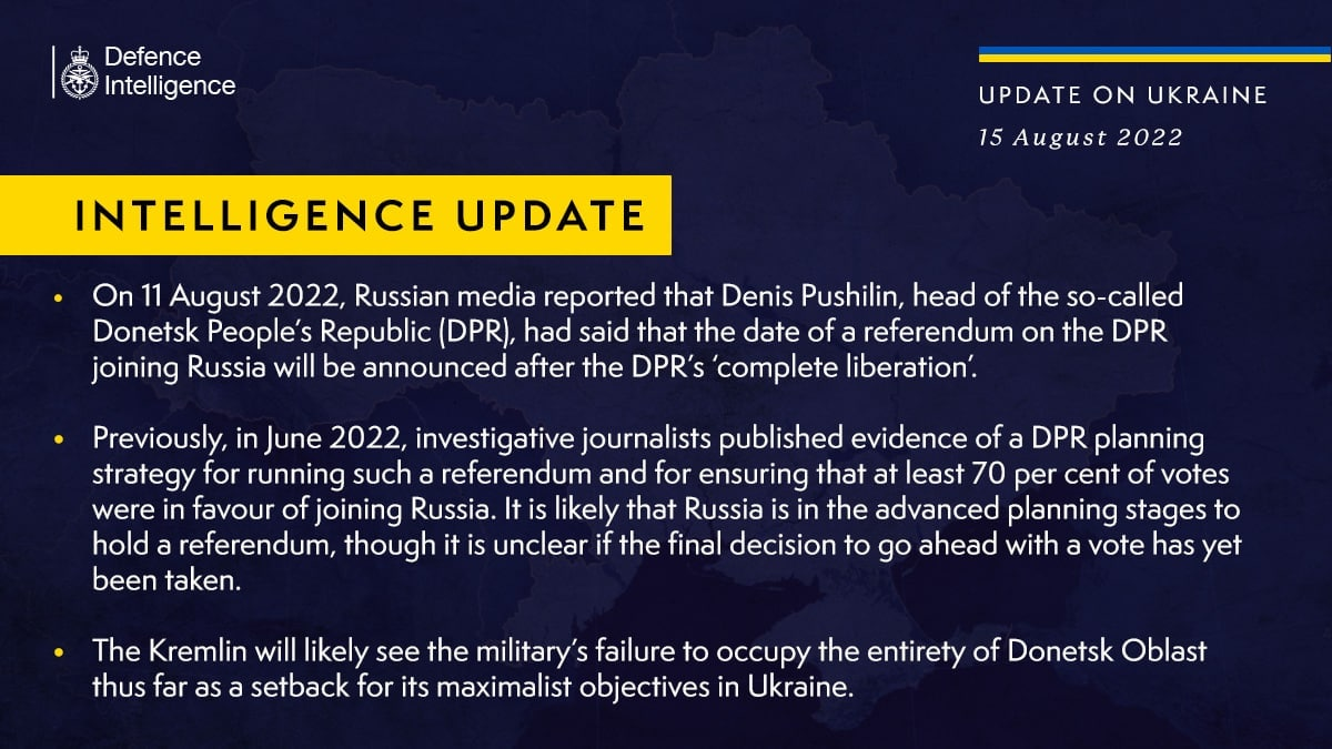 Британское ведомство упоминает, что т.н. "глава ДНР" Денис Пушилин заявил, что дата "референдума" о присоединении к России будет объявлена после "полного освобождения" "ДНР", а журналисты-расследователи в июне опубликовали доказательства, что "ДНР" в стратегии "референдума" рассчитывает на 70%-поддержку присоединения к России.