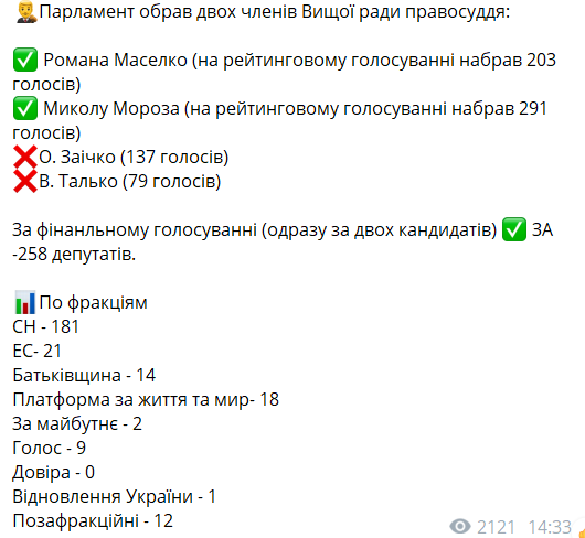 На финальном голосовании сразу за двух кандидатов проголосовали 258 депутатов. По фракциям: