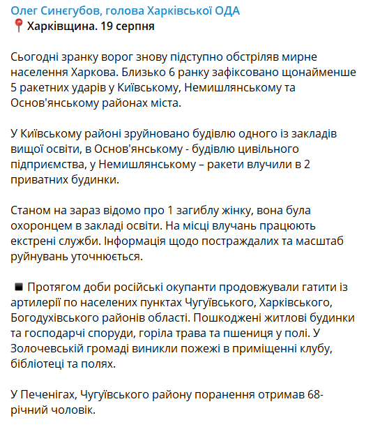 В результате обстрела Харькова утром 19 августа в городе разрушены здания одного из вузов и частного предприятия, пострадали частные дома. Об этом сообщает глава Харьковской ОВА Олег Синегубов.