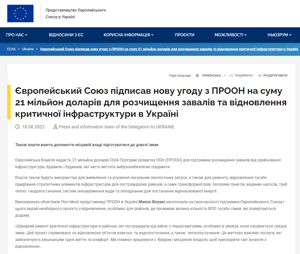 Европейская Комиссия выделит 21 миллион долларов Программе развития ООН на поддержку расчистки завалов и восстановления критической инфраструктуры в Украине.