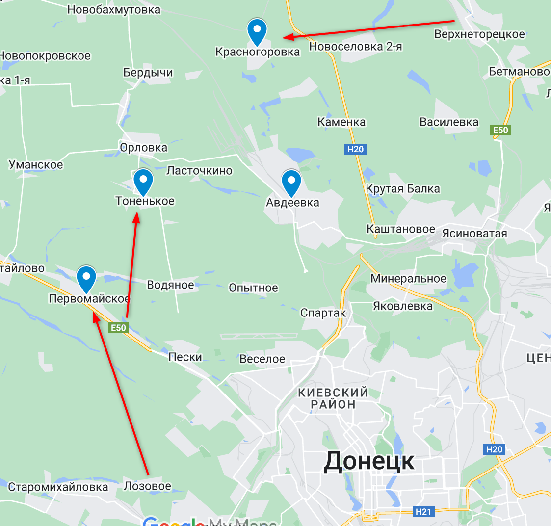 В "ДНР" сообщают, что атакуют Красногоровку и Тоненькое, что выглядит как попытка окружить Авдеевку. Украина, впрочем, о Тоненьком, как об объекте наземных атак, еще ни разу не сообщала.