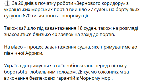 Министерство инфраструктуры Украины подвело итоги 20 дней работы инициативы "Зерновой коридор". За эти 20 дней из украинских морских портов вышли 27 судов, на борту которых совокупно вывезено 670 тысяч тонн агропродукции.