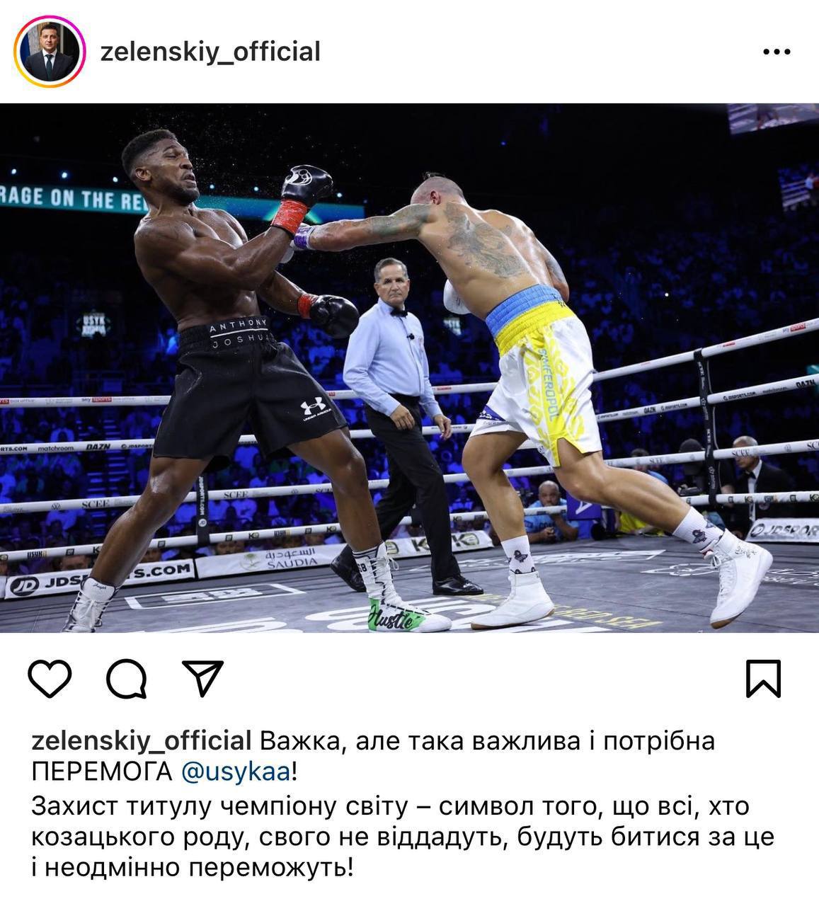 Президент Украины Владимир Зеленский поздравил украинского чемпиона, обладателя поясов WBO, WBA, IBF и IBO в супертяжелом весе Александра Усика, который защитил свои титулы в реванше с британцем Энтони Джошуа и посвятил победу ВСУ.