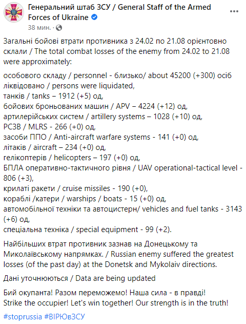 С 24 февраля потери личного состава армии РФ за время вторжения в Украину составили около 45 200 человек. За прошедшие сутки было ликвидировано 300 российских военных, наибольшие потери противник понес на донецком и николаевском направлениях.